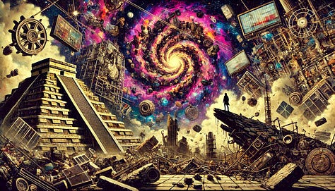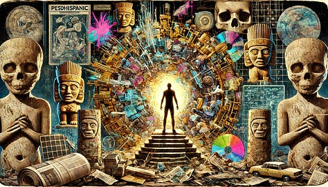 Within the decolonial framework, this collage mode operates as a visual counter-inscription, dismantling the spectacle of colonial nostalgia that permeates contemporary cultural production. Instead of reaffirming the sanitized past, these works embrace the rupture—fragments of Mesoamerican glyphs glitching into hyper-modern circuitry, Indigenous cosmologies overlaid on broken urban infrastructure, spectral traces of erased histories reanimated through radical reassembly. This aesthetic intervention reveals the liminal space where temporalities collapse, forging an anti-colonial surrealism that refuses assimilation into the dominant order.